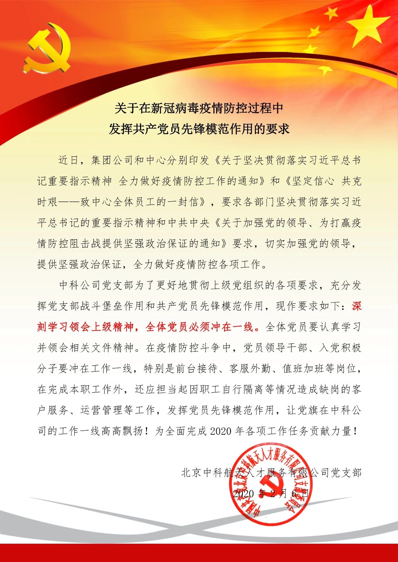 中科公司黨支部為了更好地貫徹上級黨組織的各項要求,充分發(fā)揮黨支部戰(zhàn)斗堡壘作用和共產(chǎn)黨員先鋒模范作用,特印發(fā)《關(guān)于在新冠病毒疫情防控過程中發(fā)揮共產(chǎn)黨員先鋒模范作用的要求》并強調(diào),要深刻學(xué)習(xí)領(lǐng)會上級精神,全體黨員必須沖在一線。要充分發(fā)揮黨員先鋒模范作用,讓黨旗在中科公司的工作一線高高飄揚!為全面完成2020 年各項工作任務(wù)貢獻(xiàn)力量!