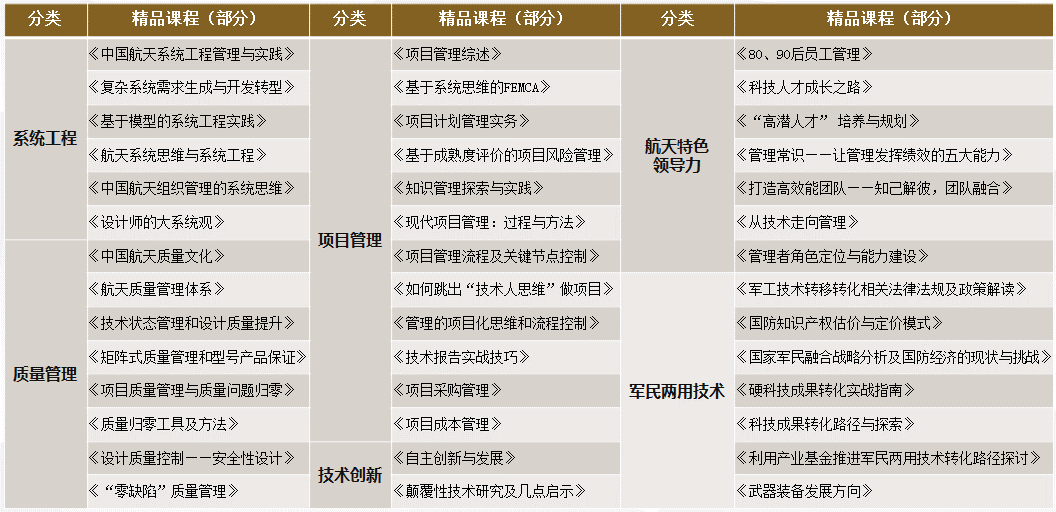“將才學(xué)院的功能定位應(yīng)當(dāng)是引領(lǐng)國家軍工領(lǐng)軍人物的塑造。”談到將才學(xué)院的定位,航天科技集團(tuán)一院原黨委副書記李光亞如是說。中國航天科工二院型號(hào)常務(wù)副總指揮袁建中同樣表示,將才學(xué)院應(yīng)當(dāng)是“定位將才,深耕細(xì)作,為國家軍民兩用高端人才的快速成長發(fā)揮國家隊(duì)的作用。”作為一個(gè)具有軍工特色的培訓(xùn)系統(tǒng)平臺(tái),將才學(xué)院共設(shè)置九大模塊、六大特色專題,1800余門課程、50余門獨(dú)家好課。主要突出系統(tǒng)工程、質(zhì)量管理、項(xiàng)目管理和技術(shù)創(chuàng)新四大軍工品質(zhì)的課程體系,探索具有軍工特色的人才培養(yǎng)之路。