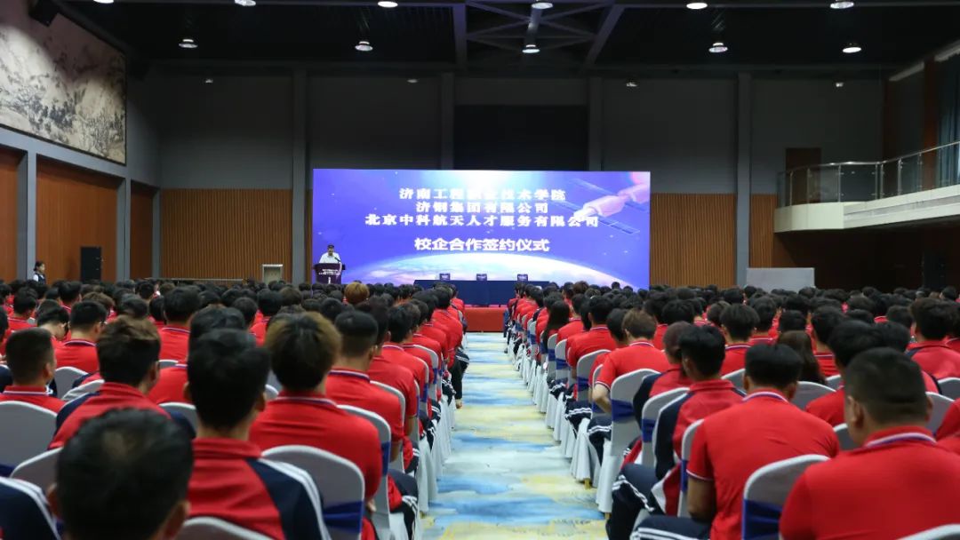 來(lái)自北京中科航天人才服務(wù)有限公司、濟(jì)南工程職業(yè)技術(shù)學(xué)院、濟(jì)鋼集團(tuán)有限公司的700余人參加了簽約儀式。
