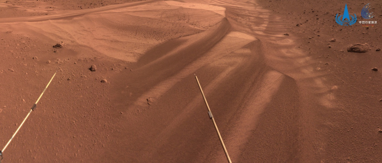 圖為祝融號(hào)火星車進(jìn)入冬季休眠狀態(tài)前拍攝的巡視區(qū)影像。圖片來(lái)源:國(guó)家天文臺(tái)