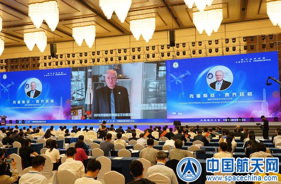 大會(huì)開幕式上,國(guó)際宇航聯(lián)合會(huì)執(zhí)行主任克里斯汀·費(fèi)奇廷格通過視頻致辭。