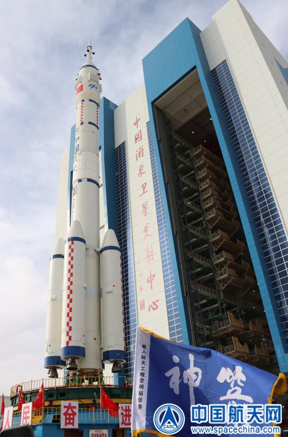 活動(dòng)發(fā)射平臺托舉長二F火箭駛出垂直總裝測試廠房(胡藍(lán)月 攝)